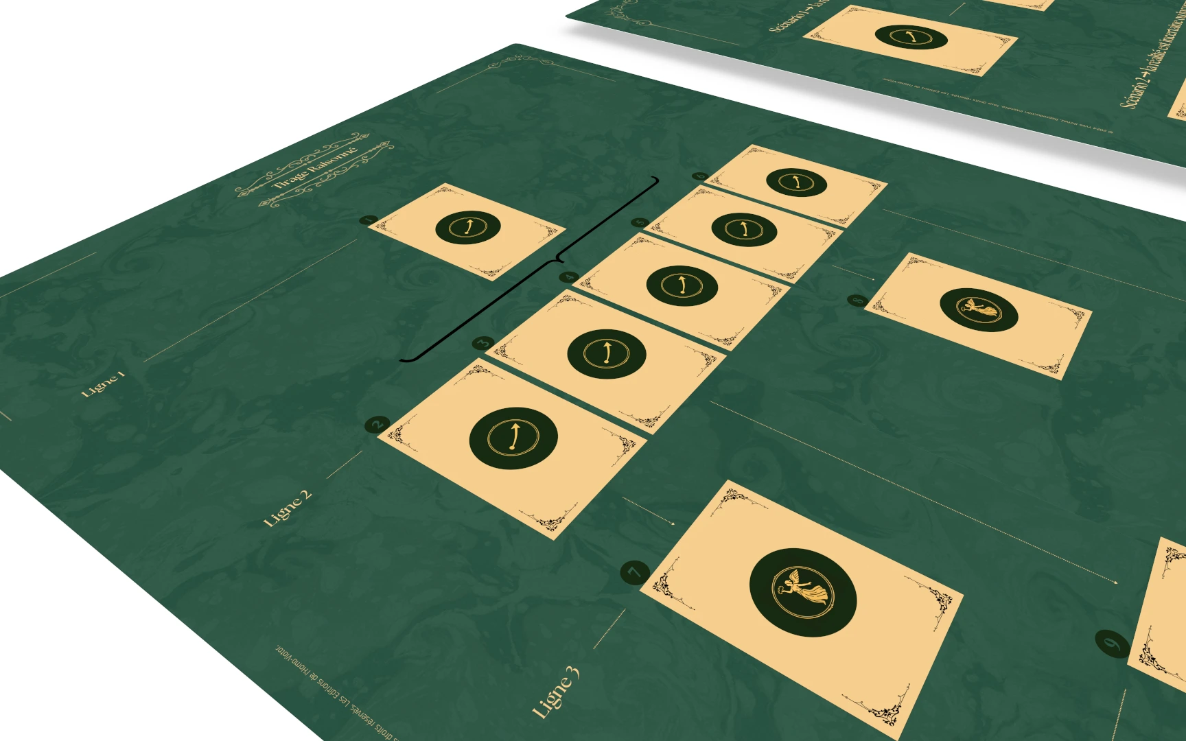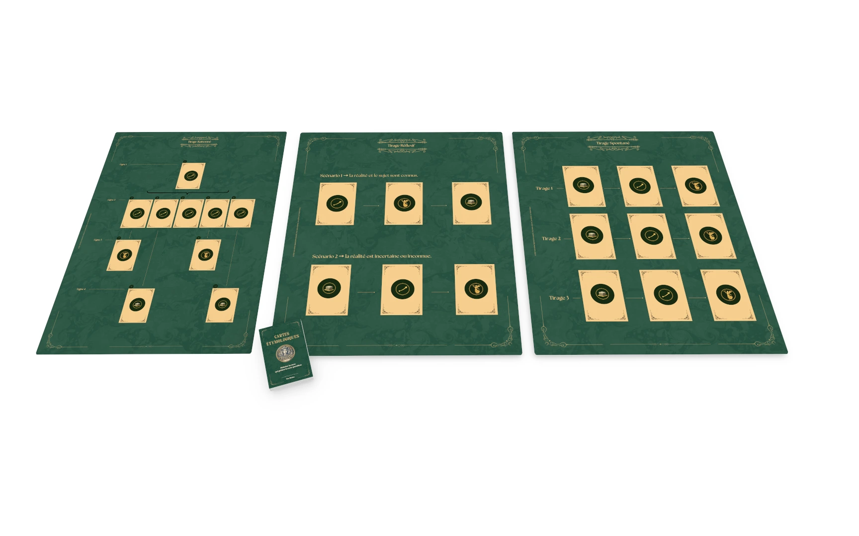 Fond vert profond, emplacements dorés, filets d'encadrement : les plateaux reprennent les codes visuels et chromatiques des cartes. L'univers est cohérent, immédiatement lisible pour vous comme pour la personne accompagnée.